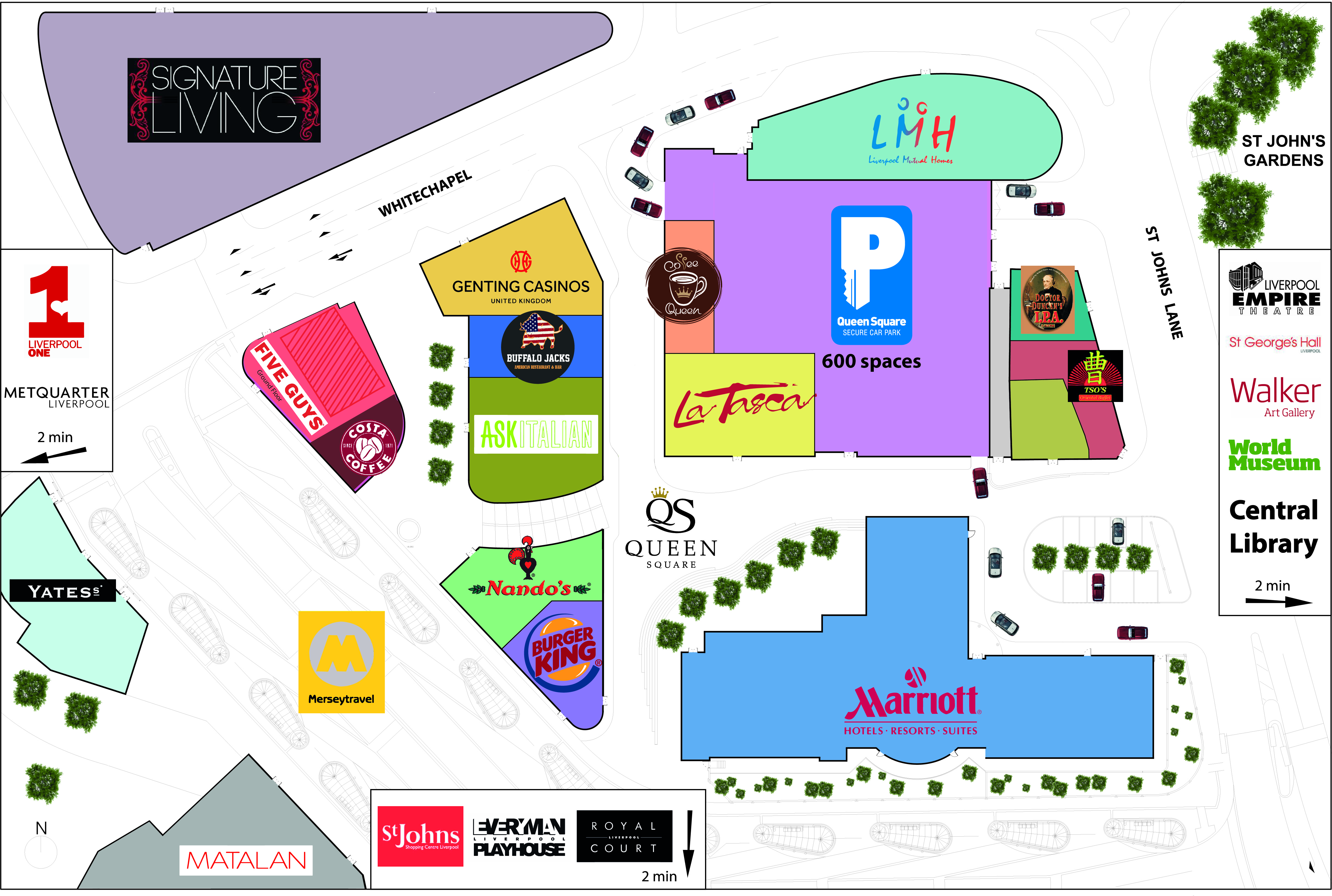 Queen Square is perfect for Parking and Dining when in Liverpool city centre as it is only minutes away from Liverpool One, the Met Quarter, Williamson Square St Johns Shopping centre and Church Street.
